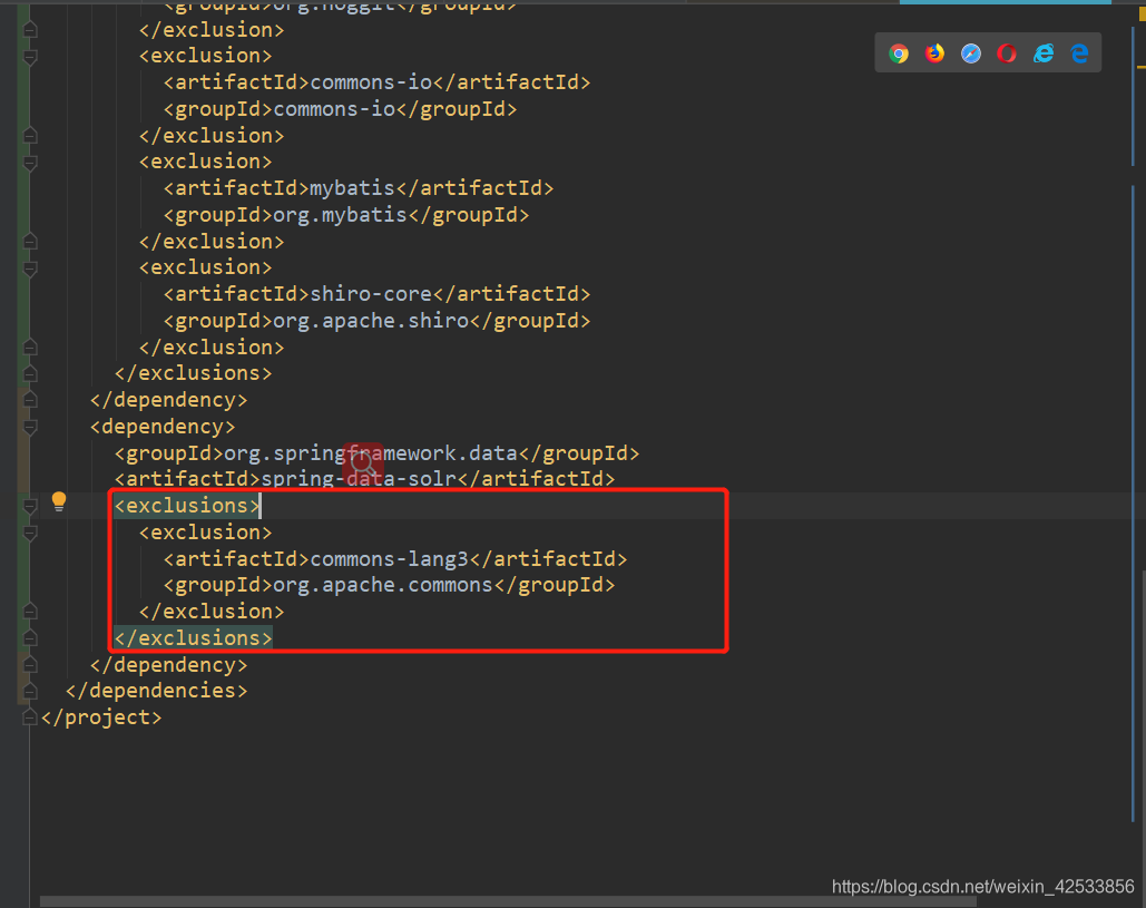 4,这时就已经去除了冲突或者重复的jar啦,maven会在某个depedency中加 <exclusions>用于去掉某个依赖里的jar。这个关键字也是面试常考的,大家记住哦!