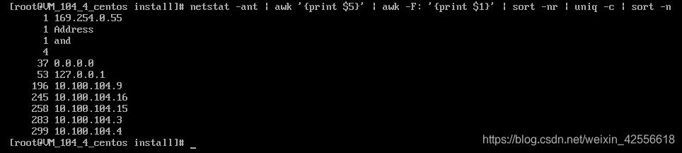 基于第四步的连接状态数统计的实现,我们可以进一步对连接到这台服务器的IP进行统计:netstat -ant | awk '{print $5}' | awk -F: '{print $1}' | sort | uniq –c | sort -n示例图如下: