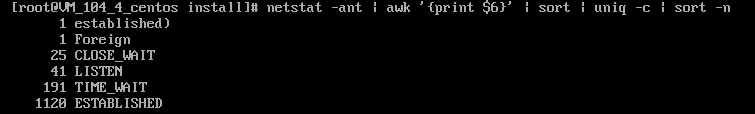 利用排序sort和重复计数uniq命令的配合,我们还可以对连接状态的数量进行统计:netstat -ant | awk '{print $6}' | sort | uniq –c | sort -n 示例图如下: