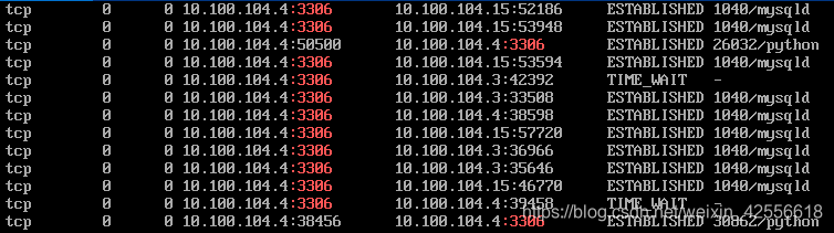 其中示例命令中的3306是端口后,注意3306前加了个英文冒号:,在后面加了个空格,这样做的原因是避免类似如33061,13306这样的包含了3306的其他端口号的干扰。通过这样的筛选后,我们就将只会看到有关于3306端口的连接情况了。示例图如下:
