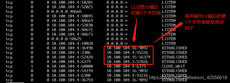 awk '{print $5}' | awk -F: '{print $1}':先把结果用空格分隔后的第5个字符串取出,再用冒号分隔后的第1个字符串取出;如下图所示: