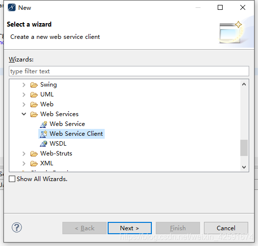 1.新建一个Web Service Project,项目上右击,NEW->Other,选择Web Service Client ->Next ->Next