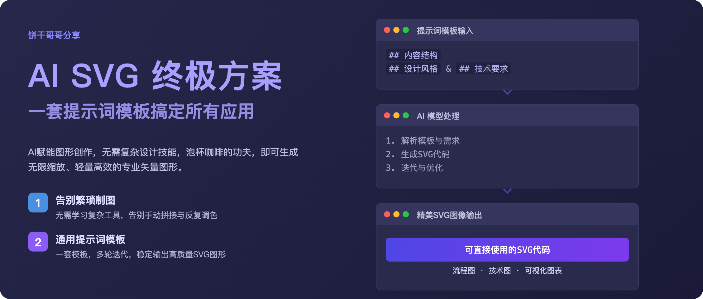 我最近也花了不少时间来分析各类SVG案例,总结出一套通用提示词模板,让你用一套模板就能生成各种精美SVG图形,无需记忆复杂提示词,无痛搞定所有应用,只有一句“so easy~”。