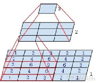 其实很好理解,我们来分析第1层,下图标出了conv3x3 s1卷积操作对每个输入值的使用次数,用蓝色数字表示,很明显越靠近感受野中心的值被使用次数越多,靠近边缘的值使用次数越少。5x5输入是特殊情况刚好符合高斯分布,3x3输入时所有值的使用次数都是1,大于5x5输入时大部分位于中心区域的值使用次数都是9,边缘衰减到1。每个卷积层都有这种规律,经过多层堆叠,总体感受野就会呈现高斯分布。