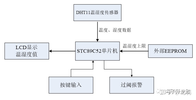 本设计总体思路为:信息采集→信息处理→信息显示/报警。它的主要模块为单片机模块,温湿度采集模块,显示模块,键盘模块,LED报警模块,电源模块,阈值设置模块,设计方块图如下。