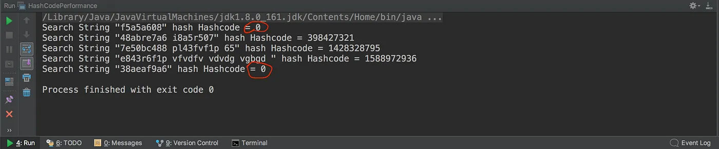 我们可以看到查找时间异常的两个字符串其 hashCode 都为 0。现在,是时候深入研究一些代码并查看实现情况了。