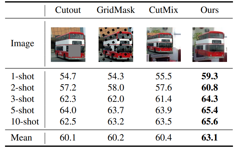 为了增加新类样本的数量,本文采用CutMix方法将基类图像与新类对象结合,将整个对象补丁从新类图像中裁剪出来,并应用简单的随机数据增强,如缩放/翻转/颜色退化。然后将增强的对象补丁粘贴到基类图像上,通过重复这个过程,生成包含来自新类和基类的样本的合成集。