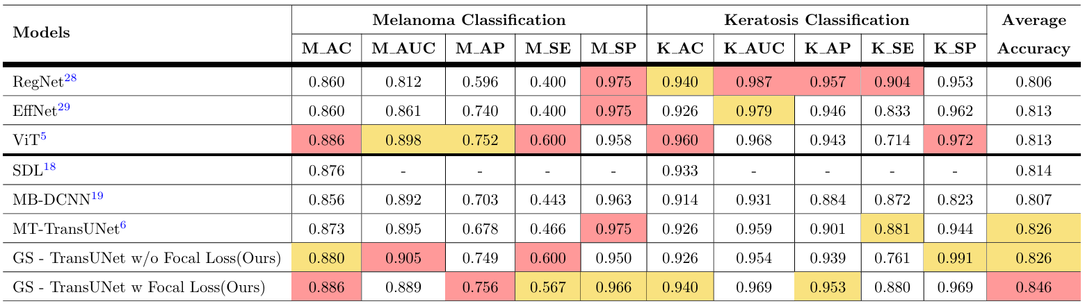方法:论文提出了一种名为GS-TransUNet的方法,将Transformer和UNet结合,通过2D高斯溅射技术生成精确分割掩码,同时实现皮肤病变的分类和分割任务,提升了诊断精度。