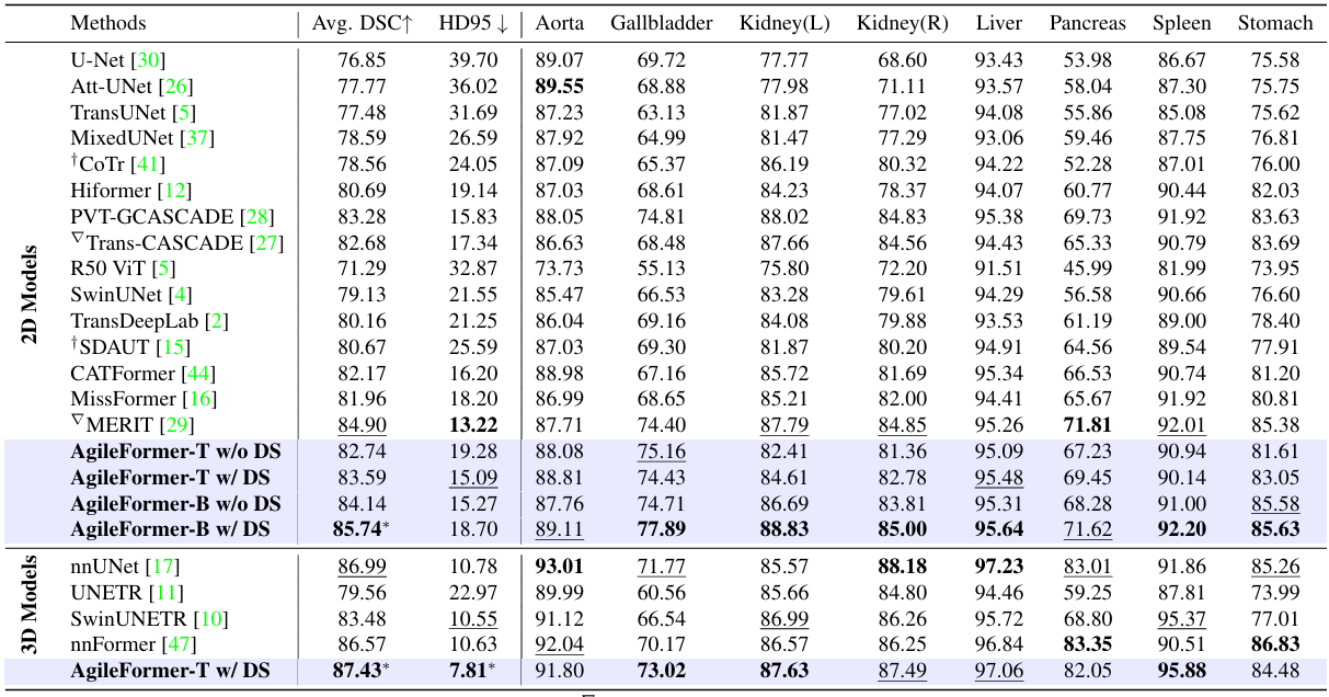 方法:论文提出了一种名为AgileFormer的医学图像分割模型,它是基于Transformer和UNet架构的结合,通过可变形的动态组件捕捉不同形状和大小的器官特征,分割效果更好。