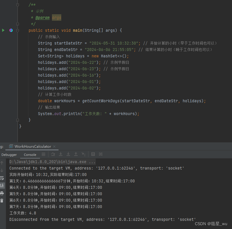 【Java开发-工作日计算】使用Java中的LocalDateTime对象计算工作日 计算给定开始时间、结束时间以及节假日列表之间的工作小时数(不包括周末、节假日以及非工作时间,例如每天的晚上和凌晨) 早上如果不到9点,按9点开始算;下午如果超过17点,按17点结束算