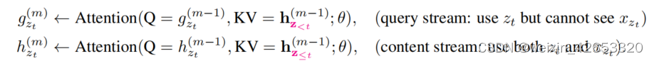 其中,Q、K、V表示注意操作[33]中的查询、键和值。内容表示的更新规则与标准的自注意完全相同,所以在微调过程中,我们可以简单地删除查询流,并将内容流作为一个普通的转换器(-XL)使用。最后,我们可以使用最后一层的查询表示g(M)zt来计算等式 (4).