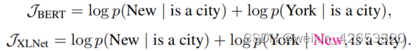 为了更好地理解两者的区别,让我们考虑一个具体的例子[New, York, is, a, city]。假设BERT和XLNet都选择了两个标记[New,York]作为预测目标,并最大化log p(New York|is a city)。同时假设XLNet对因子分解顺序进行抽样[is,a,city, New, York]。在这种情况下,BERT和XLNet分别减少到以下目标: