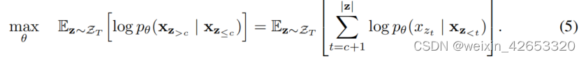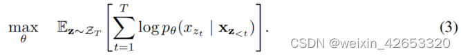为了使这个想法形式化,让ZT是长度-T索引序列[1,2,……,T]的所有可能排列的集合。我们使用Zt和z<t来表示排列z∈ZT的第t个元素和前t-1个元素。然后,我们提出的排列语言建模目标可以表示为: