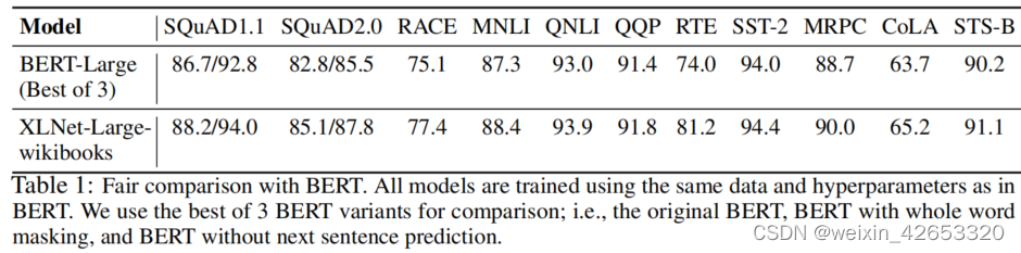 在这里,我们首先比较了BERT和XLNet的性能,以解耦使用更多数据的影响,以及从BERT到XLNet的改进。在表1中,我们比较了使用相同的数据和超参数训练的BERT和(2)XLNet的三种不同变体的(1)最佳性能。正如我们所看到的,在相同的数据上使用几乎相同的训练方法进行训练时,XLNet在所有考虑的数据集上都大大超过了BERT。