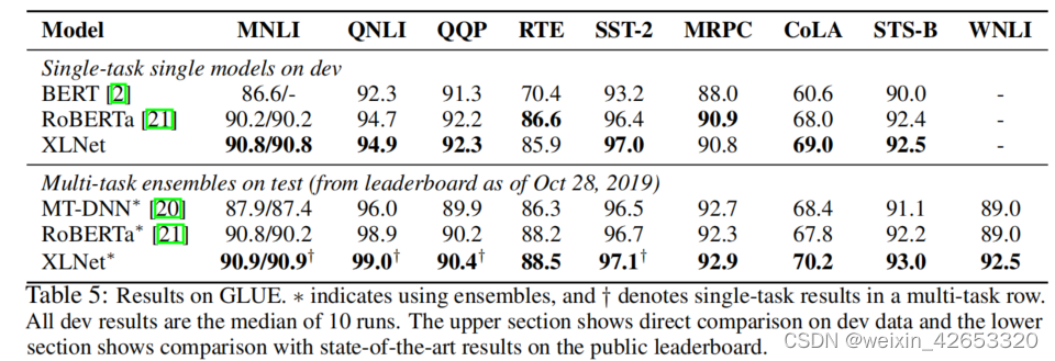 结果如表2(阅读理解和文档排名)、表3(问题回答)、表4(文本分类)和表5(自然语言理解)所示,其中XLNet的性能一般优于BERT和RoBERTa。此外,我们还做了两个更有趣的观察结果:1)对于涉及更长上下文的像SQuAD和RACE这样的显式推理任务,XLNet的性能增益通常更大。这种在处理更长的上下文方面的优势可能来自于XLNet中的转换器-xl主干。2)对于已经有大量监督例子的分类任务,如MNLI(>390K)、Yelp(>560K)和Amazon(>3M),XLNet仍然会带来巨大的收益。