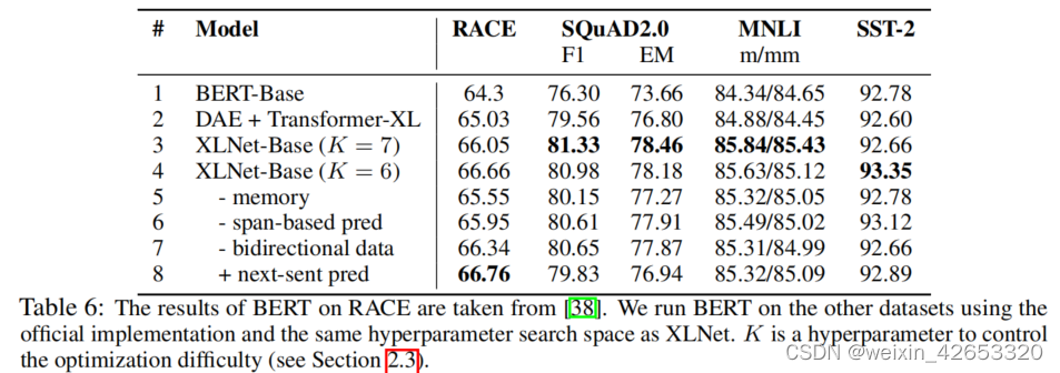 考虑到这些目的,在表6中,我们比较了6个具有不同实现细节的XLNet-Base变体(第3-8行),原始的BERT-Base模型(第1行),以及一个使用BERT中使用的去噪自动编码(DAE)目标,但使用双向输入管道(第2行)。为了进行公平的比较,所有的模型都是基于一个12层的架构,具有与BERT-Base相同的模型超参数,并且只在维基百科和图书语料库上进行训练。所有报告的结果都是5次运行的中位数。