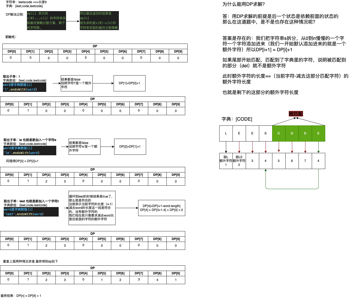LeetCode:字符串中的额外字符 题目描述:给你一个下标从 0 开始的字符串 s 和一个单词字典 dictionary。你需要将 s 分割成若干个 互不重叠 的子字符串,每个子字符串都在 dictionary 中出现过。s 中可能会有一些 额外的字符 不在任何子字符串中。请你采取最优策略分割 s ,使剩下的字符 最少。