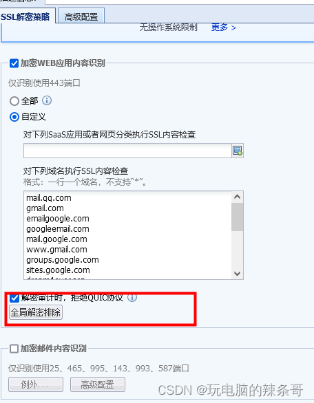 环境: 电脑:联想E14 系统:Windows 10 专业版 64位 AC:深信服AC13.0.47 问题描述: 用户登入腾讯视频,QQ扫描二维码不显示二维码 解决方案: 1.在AC上,在线用户列表搜索一下源IP地址,然后点开查看用户匹配的策略,是否有匹配到SSL解密策略 全网监控–入网用户管理–在线用户列表,SSL解密策略 2.ssl.ptlogin2.qq.com将这个域名地址添加在SSL解密排除域名列表 3.测试,访问正常