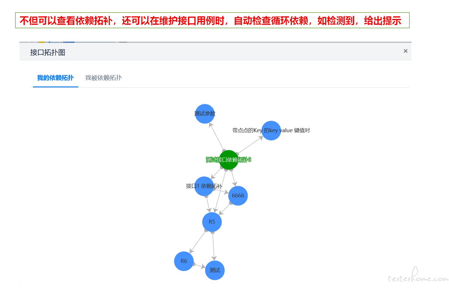 不但可以查看依赖拓补,还可以在维护接口用例时,自动检查循环依赖,如检测到,给出提示