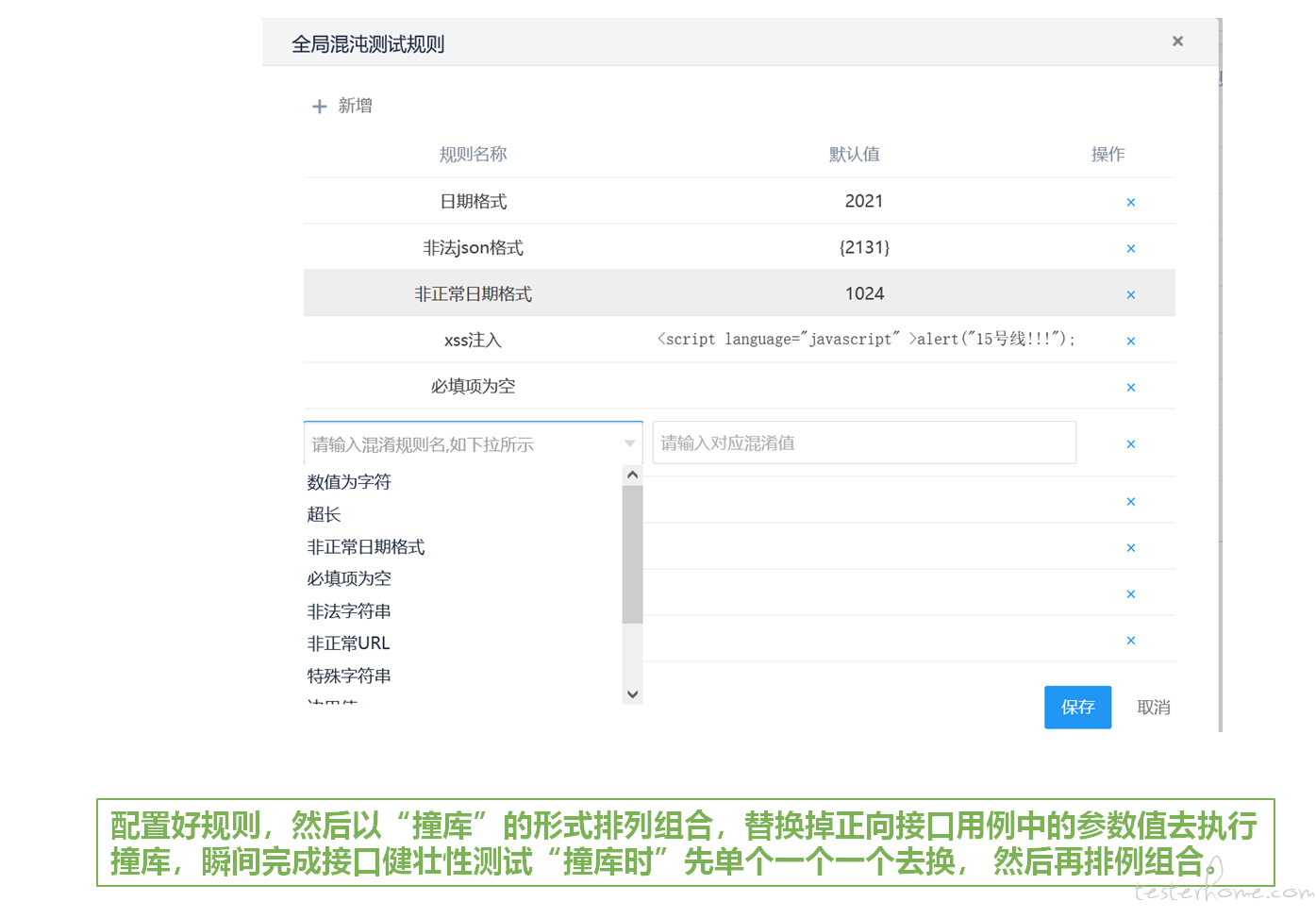 一说反向测试大家第一反应是,通过数据驱动来测试,如果复杂 JSON 数据结构,数据驱动按传统的方式,对测试人员来说一点不方便,这两个我们都是这样来解决的接口反向或是混沌测试,只需要配置好混沌规则 ,然后以 “撞库” 的形式排列组合,替换掉正向接口用例中的参数值去执行撞库,瞬间完成接口健壮性测试 “撞库时” 先单个一个一个去换, 然后再排例组合。
