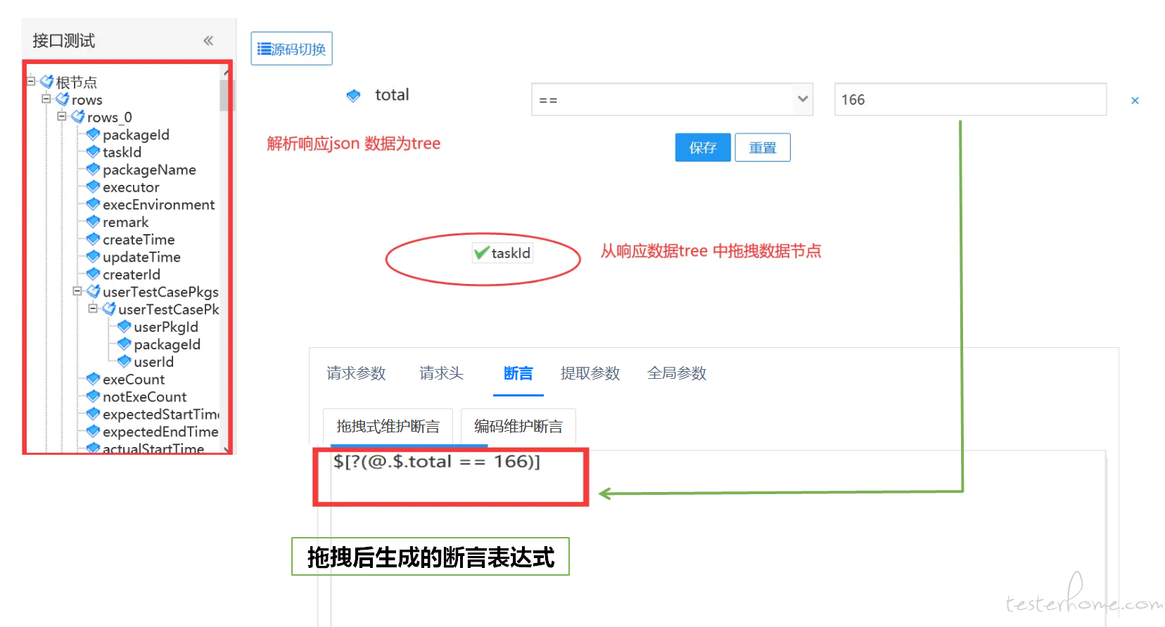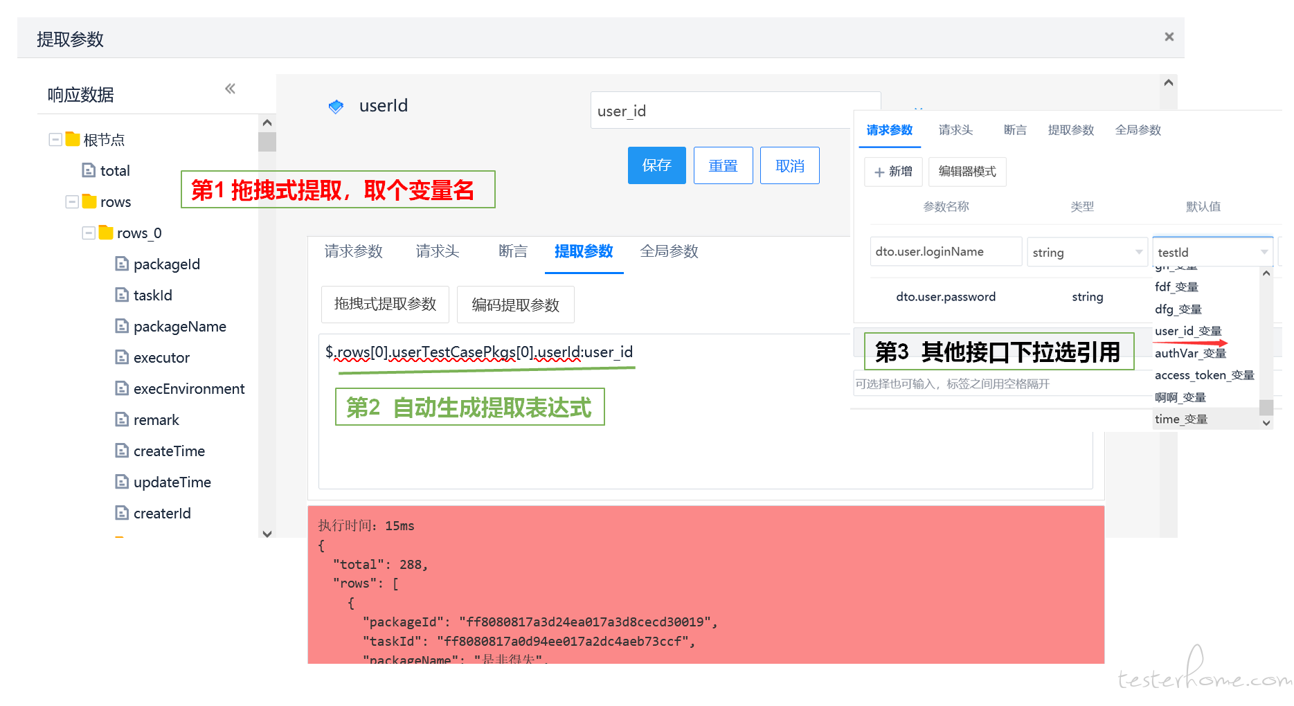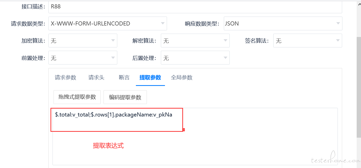 提取表达式为 :$.total:v_total;$.rows[1].packageName:v_pkNa