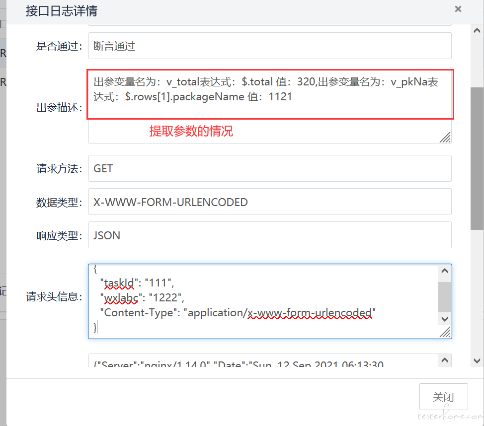 提取了两个变量 (出参),下图为接口日志中,出参输出值