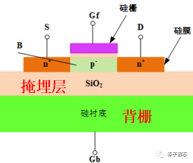SOI MOSFET工艺介绍 SOI MOSFET衬底和沟道之间是埋氧化层,衬底相对沟道区也相当于一个MOS结构,因此把SOI MOSFET的衬底叫做背栅,SOI MOSFET是五端器件:栅、源、漏、体和衬底五端。