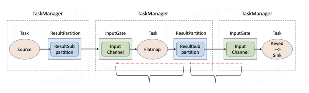 Flink 1.5+版本为了解决这两个问题,引入了基于Credit的流控和反压机制。它本质上是将TCP的流控机制从传输层提升到了应用层——即ResultPartition和InputGate的层级,从而避免在传输层造成阻塞。具体来讲: