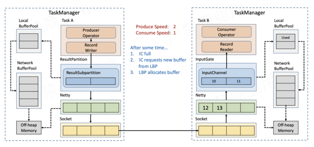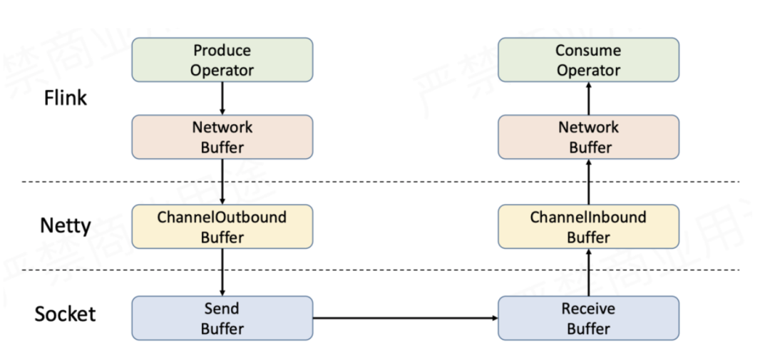 Sender在发送数据时,首先写入TaskManager内部的网络缓存,利用Netty进行传输——将待发送的数据存入Netty的ChannelOutboundBuffer,再经由Socket的发送缓存发送出去。Receiver在接收数据时是反过来的,同样要经过3层缓存,即Socket接收缓存→Netty ChannelInboundBuffer→TaskManager网络缓存。要实现流量控制,就是在上面的流程上做文章。