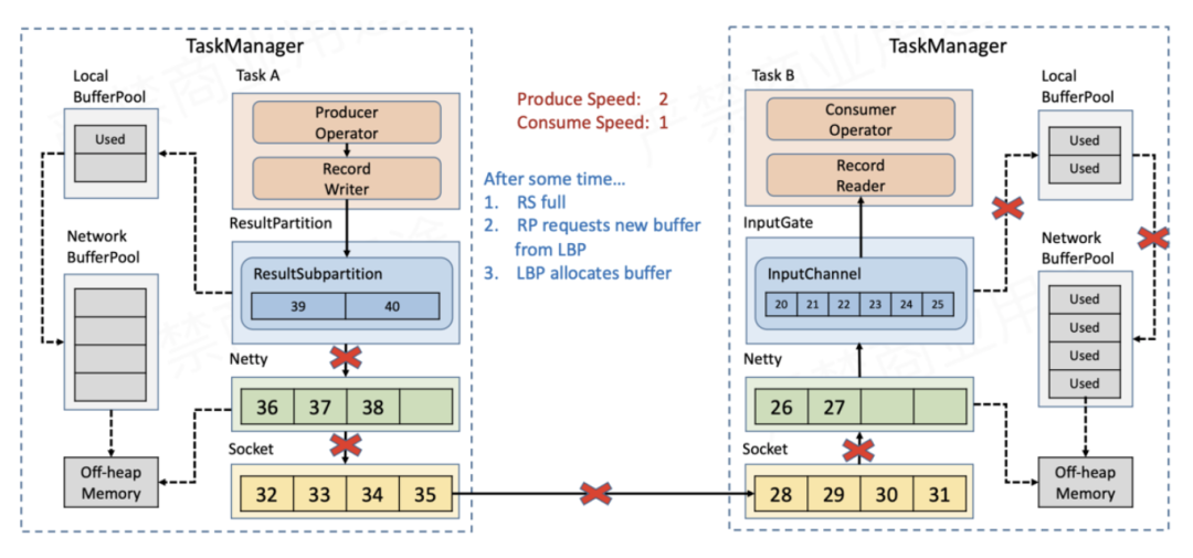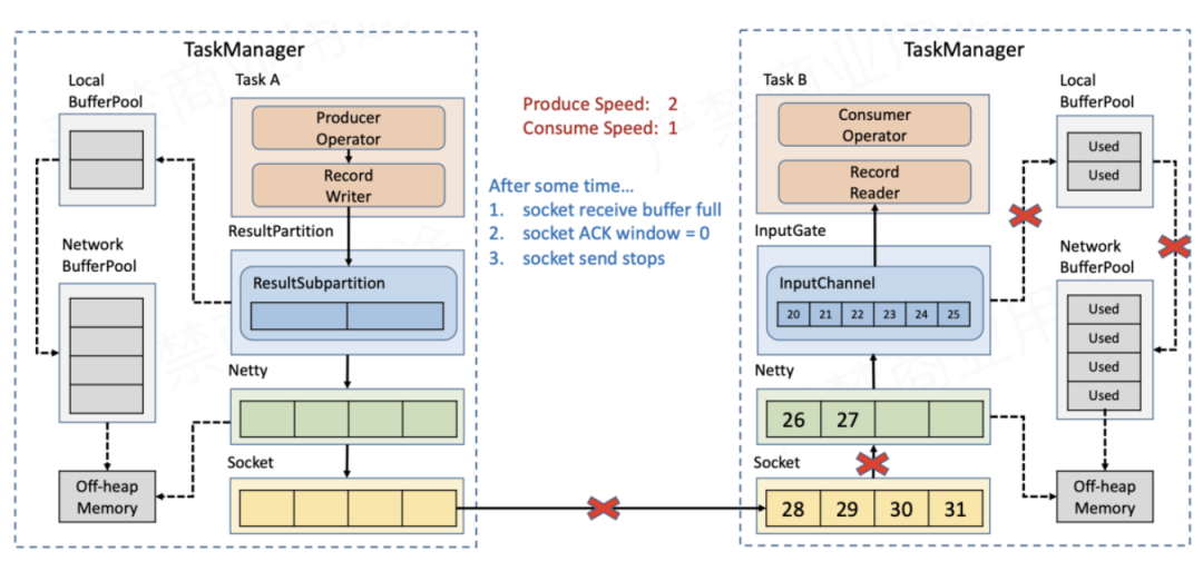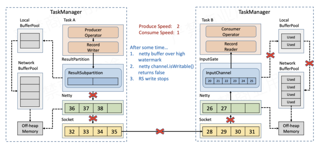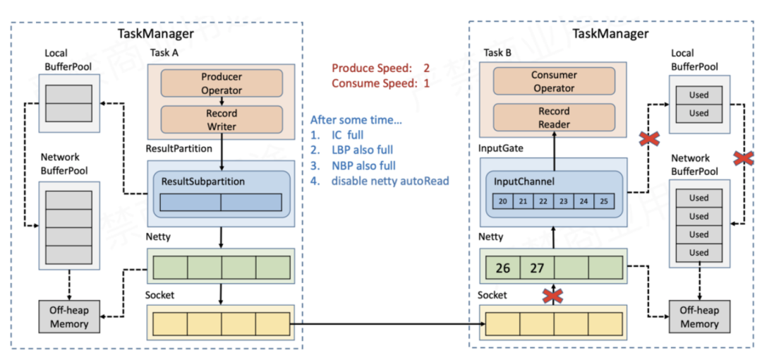 随着数据不断积压,NetworkBufferPool的额度也会被耗尽,此时没有空间再接收新的数据,Netty的auto read会被关闭,不再从Socket缓存读取数据。