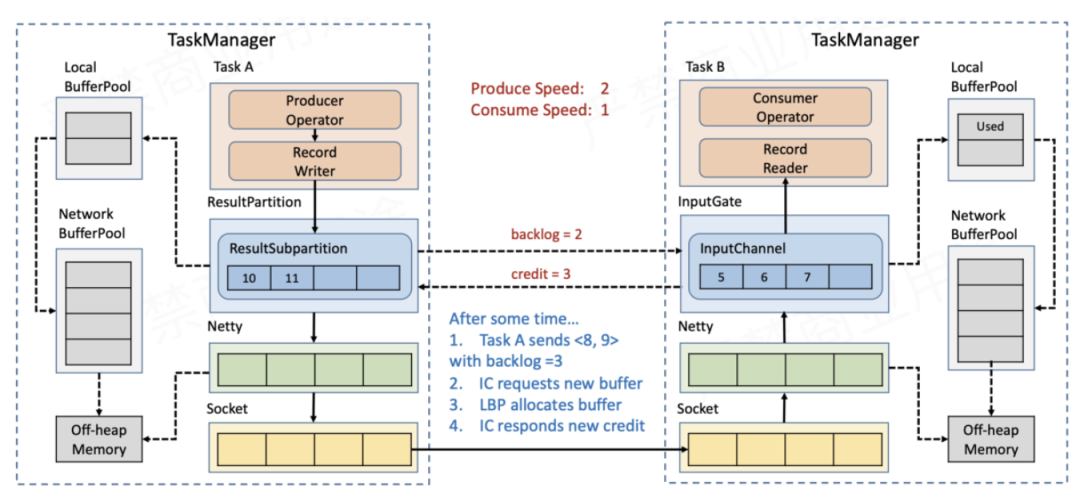 也就是说,Sender和Receiver通过互相告知对方自己的处理能力的方式来精准地进行流控(注意backlog size和credit也是要通过传输层的,不是直接交换的)。接下来仍然通过实例来说明基于Credit的流控和反压流程。