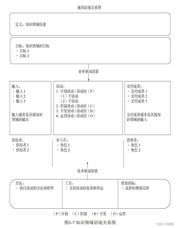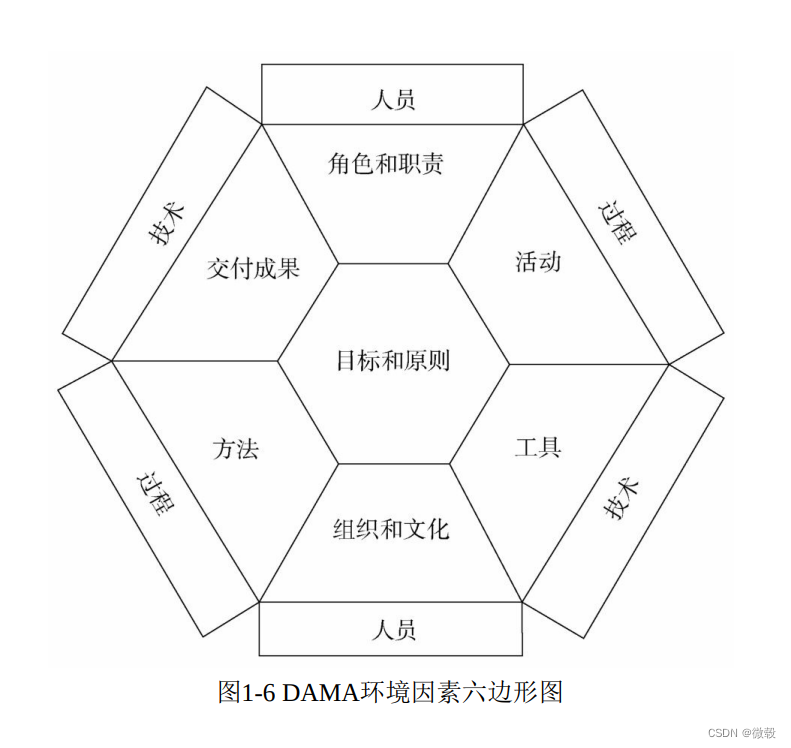 环境因素六边形图显示了人、过程和技术之间的关系,是理解 DMBOK语境关系图的关键。它将目标和原则放在中心,因为这些目标和原则为人们如何执行活动及有效地使用工具成功进行数据管理提供了指导。
