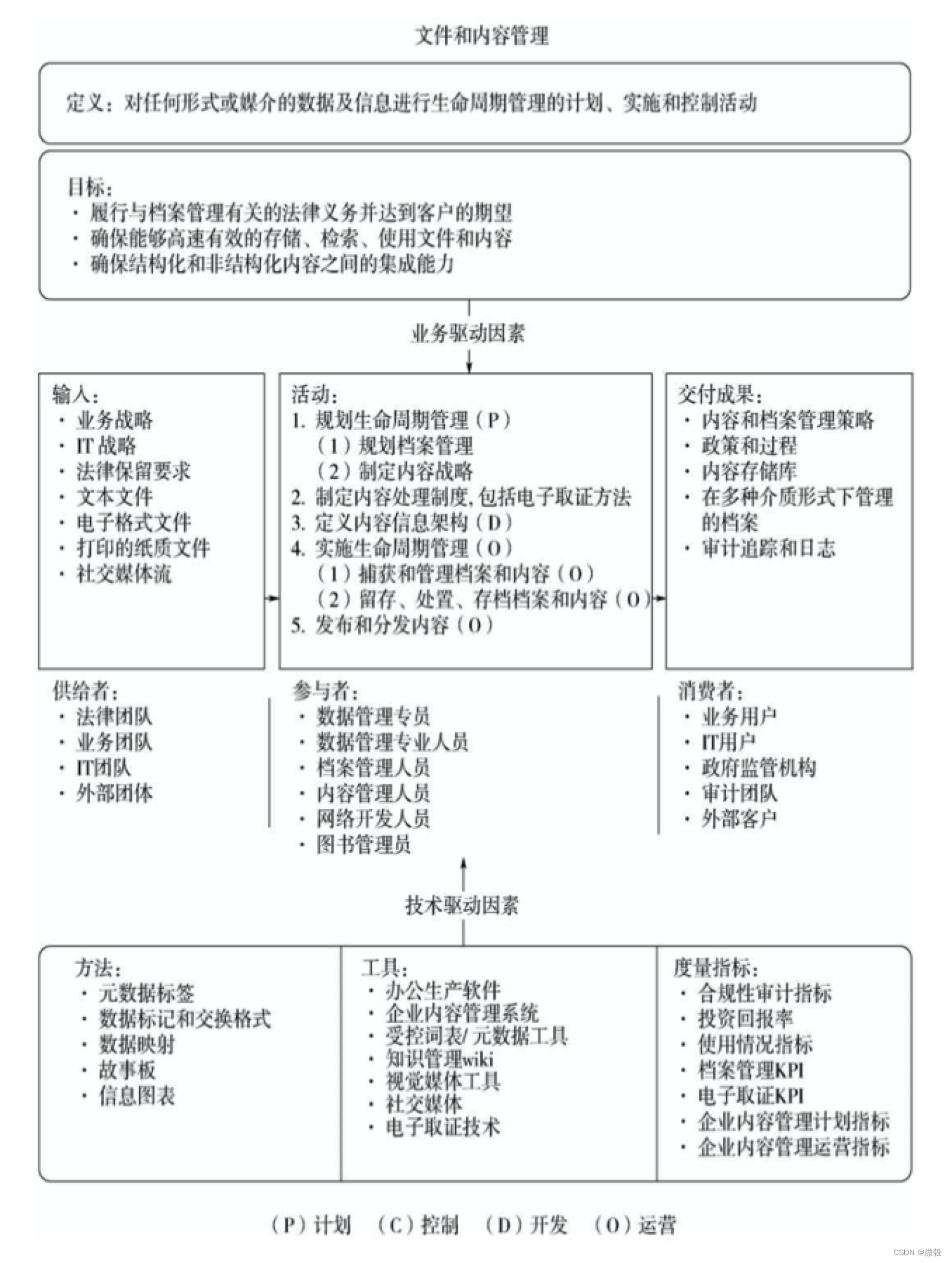 本文探讨了企业内容管理的核心概念,包括法规遵从性、目标与原则、关键术语如元数据和受控词表、档案管理流程、数字资产管理、工具如企业内容管理系统和电子取证技术的应用。此外,文章还强调了诉讼应诉准备和信息治理的重要性。