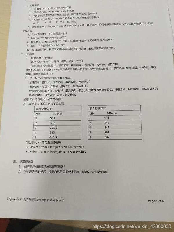 本文是一份关于数据库操作和ETL流程的笔试题,涉及SQL语句、数据库概念、ETL过程和相关工具。内容涵盖group by、delete、drop、truncate的区别,关系查询的索引类型,Tomcat与Weblogic的部署区别,Linux命令,以及存储过程的编写。同时,介绍了OLTP与OLAP系统的特性,并给出若干查询题和思维拓展题,如电话接听礼仪和客户投诉处理流程。