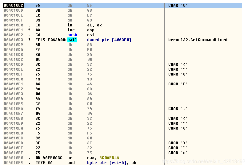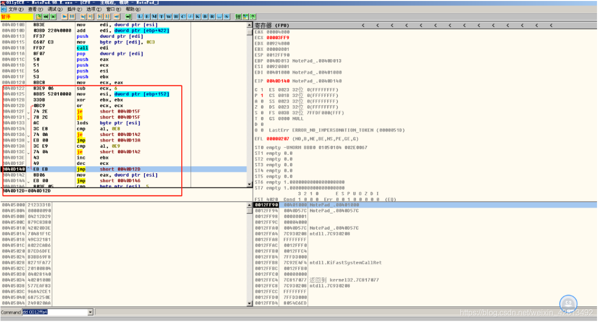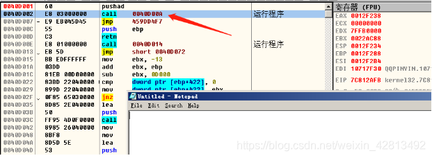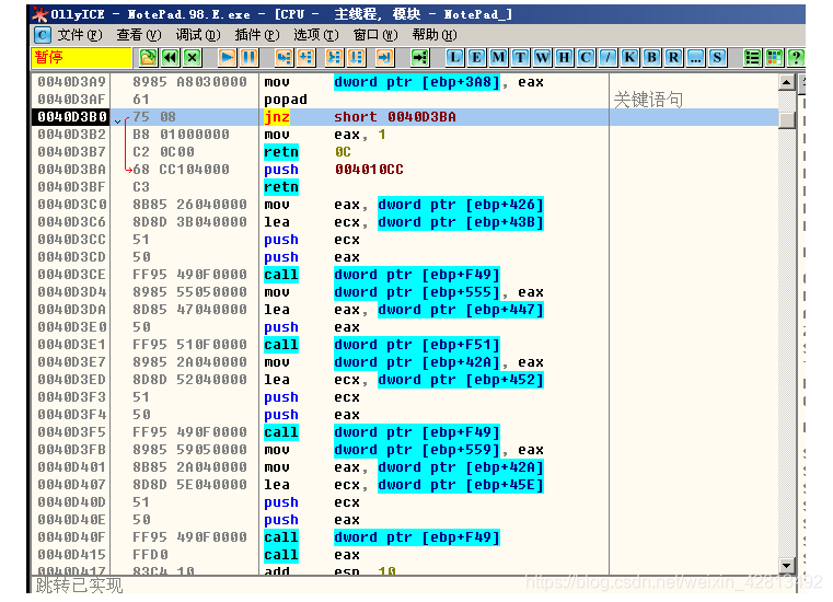 遇到运行程序的call,同理,备注后F7进入,单步跟踪时,遇到向下的跳转无需过问,向上的跳转,如下图
