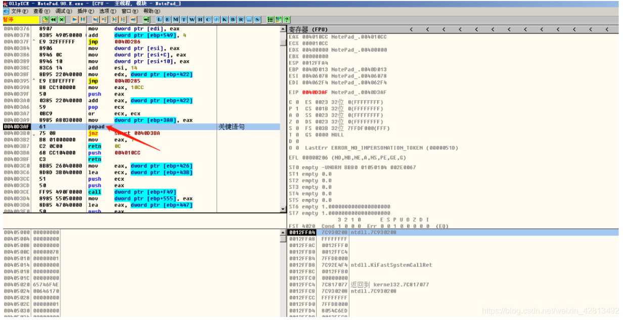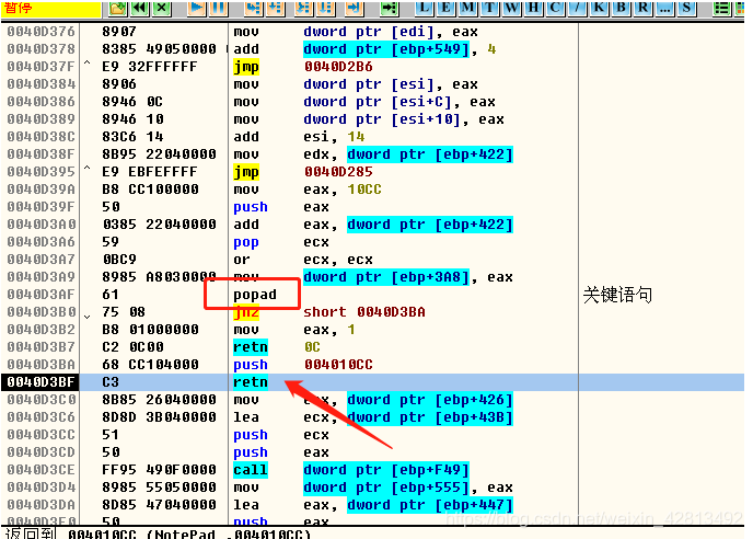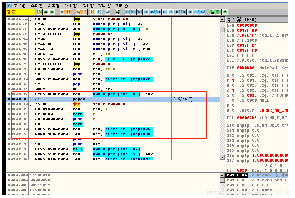 此时仔细查看语句,与之前单步追踪到的语句一样,在popad关键语句之后了