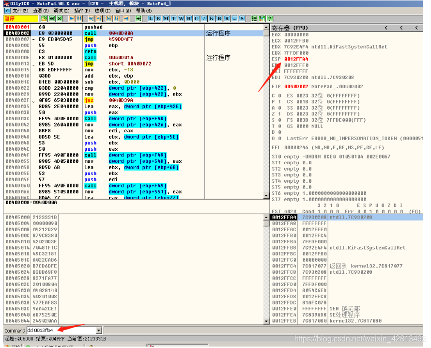 2.在命令行下:dd XXXXXXXX(指在当前代码中的ESP地址,或者是hr XXXXXXXX),按回车!