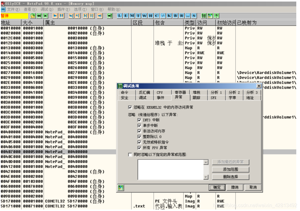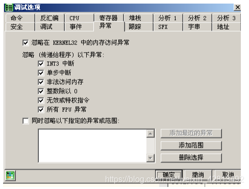 1:设置OD,忽略所有异常,也就是说异常选项卡里面都打上勾