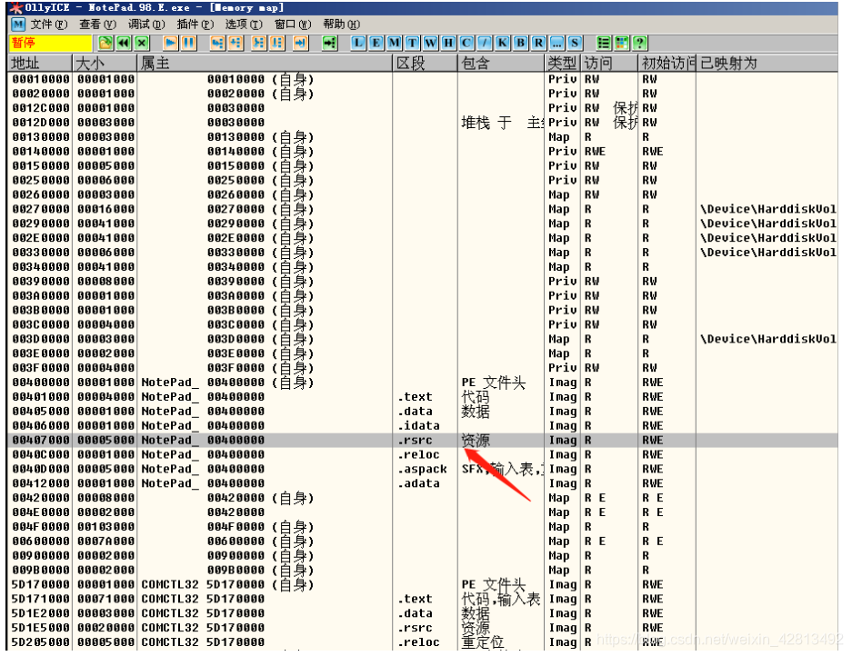 首先用OD打开程序后ALT+M进入内存,找到程序的.rsrc,F2下断点