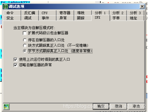2:切换到SFX选项卡,选择“字节模式跟踪实际入口(速度非常慢)”,确定。
