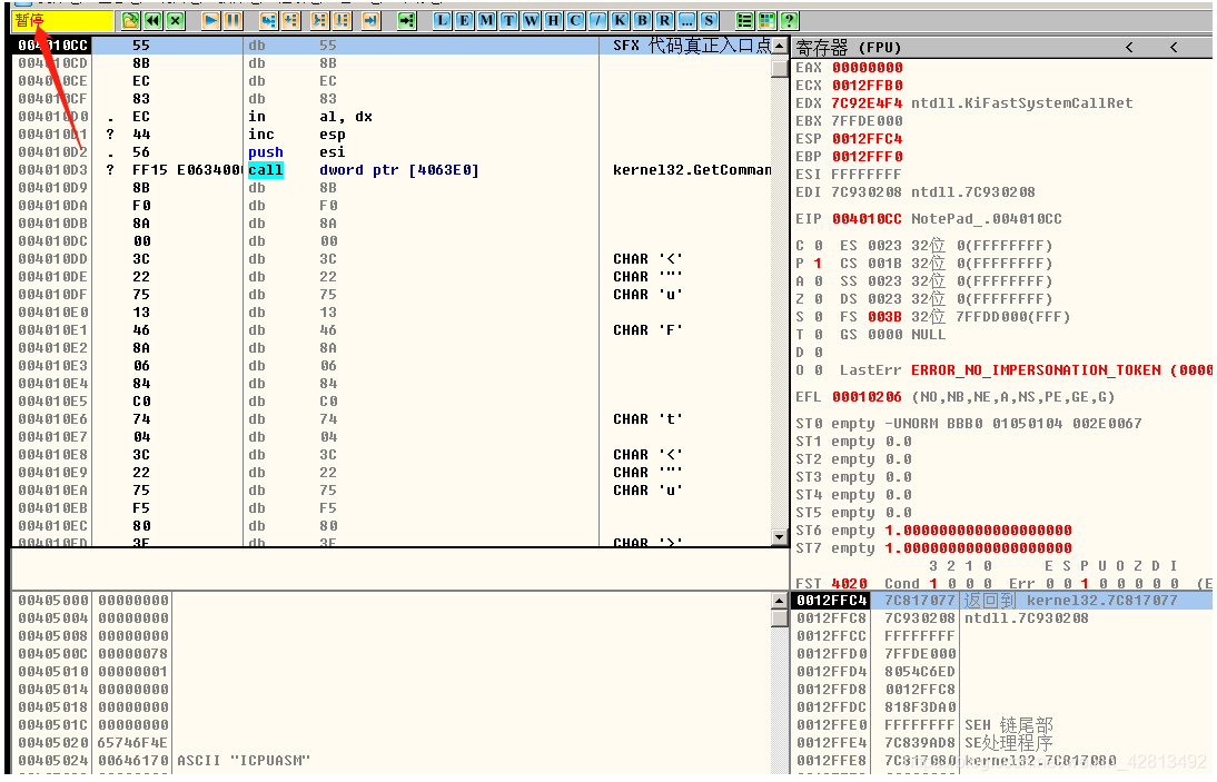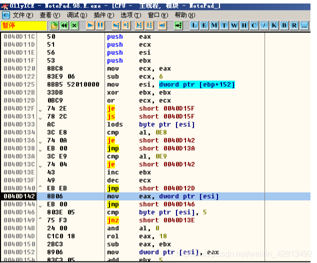4.按一下F9运行程序,直接来到了跳转处,按下F8,到达程序OEP。
