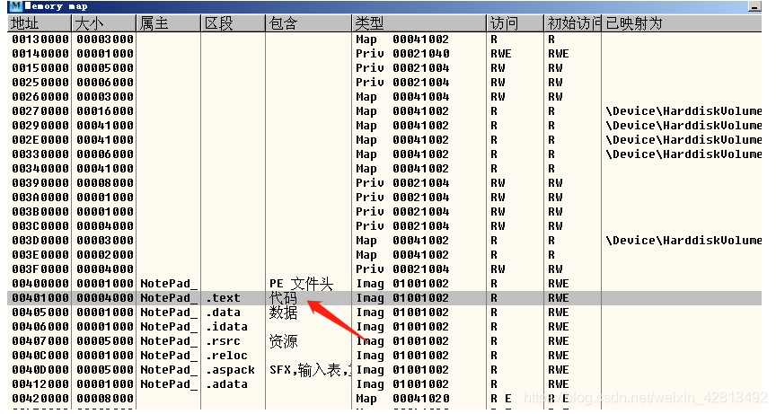 3:按ALT+M,打开内存镜象,找到程序的第一个.rsrc.按F2下断点,然后按SHIFT+F9运行到断点,接着再按ALT+M,打开内存镜象,找到程序的第一个.rsrc.上面的.CODE(也就是00401000处),按F2下断点!然后按SHIFT+F9(或者是在没异常情况下按F9),直接到达程序OEP