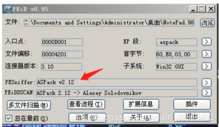 先对软件进行查壳,发现是ASPack壳,使用OD打开软件