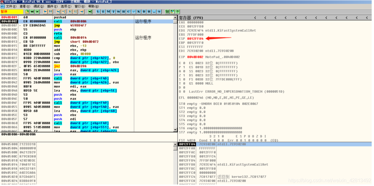 1.开始就点F8,注意观察OD右上角的寄存器中ESP有没突现(变成红色)。(这只是一般情况下,更确切的说我们选择的ESP值是关键句之后的第一个ESP值)