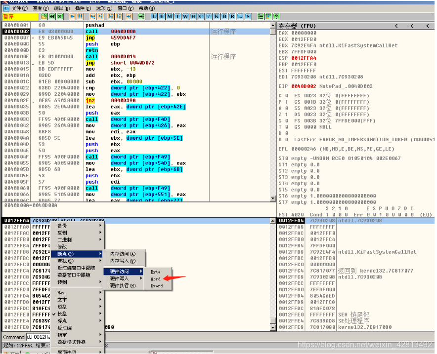 3.选中下断的地址,断点--->硬件访--->WORD断点。