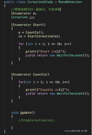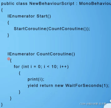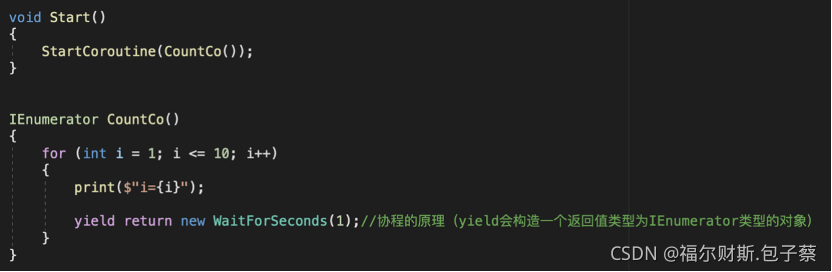 协程调用的函数,不带返回值,IEnumerator是协程的固定用法,对应StartCoroutine来启动协程(这样配合相当于在unity当中登记了一个协程,然后unity会在游戏的每一帧当中定时调用这段协程)