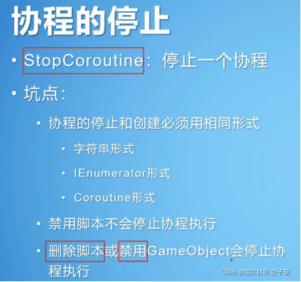 (协程脚本可以随便挂载在场景中的任意一个物体上)禁用脚本不能停止协程;移除脚本(Destory(this))可以停止协程