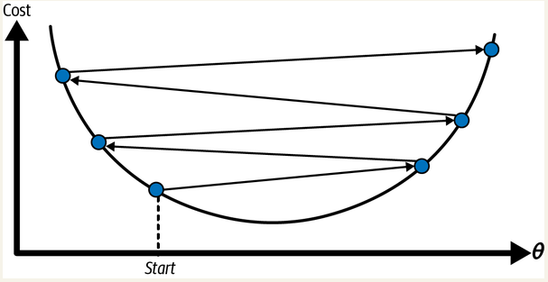 如果每步太大,算法可能会发散,相当于从山的一侧直接跨到了另一侧更高的位置