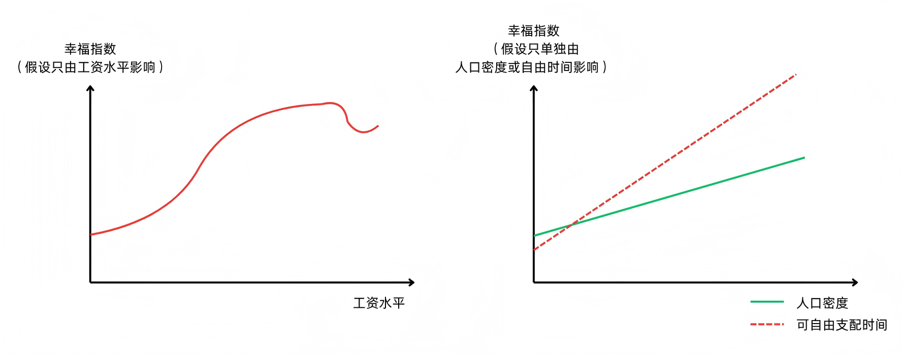 但是,每种因素对于最终幸福指数的影响一般是不同的:大多数人可能希望拿比较多的工资,但是工资过高可能意味着额外的负担;人们对可自由支配的时间,可能比对人口密度更加敏感……