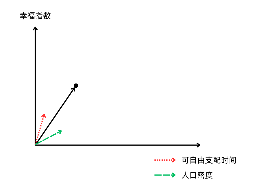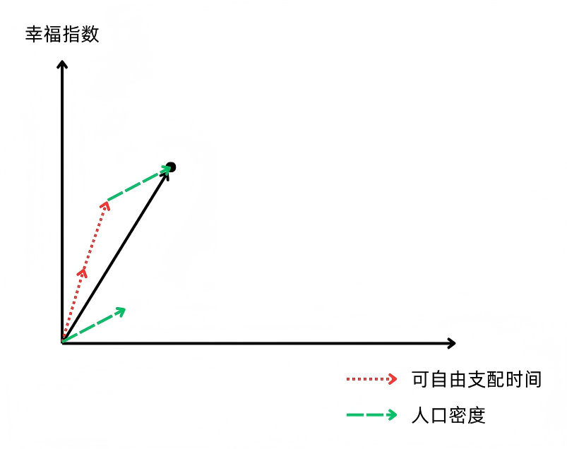 这里,“人口密度”和“可自由支配时间”两个因素,分别由两个斜率不同的向量箭头表示,长度均为1(这也叫单位向量)